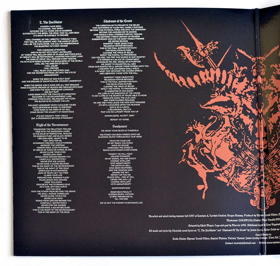 Recorded and Mixed at: Conclave & Earshot Studio, Bergenn, Norway Summer, 2007 ( Conclave & Earshot Studio is a recording studio in Bergen, Norway. In 2007 this facility was used to record: DEAD TO THIS WORLD's First Strike for Spiritual Renewance ) Sound mix by: Bjørnar Erevik Nilsen, Iscariah, Kvitrafn Mastering by: The Cutting Room (The Cutting Rom is a New York Mastering, mixing and tracking Recording Studio.) Artwork: Chris Moyen (Christophe Moyen is a French artist and graphic designer who focused on metal releases. Working since 1990.) Marcelo Hvc (real name: Marcelo Vasco) Marcelo has done the artwork for dozens of Metal bands. |