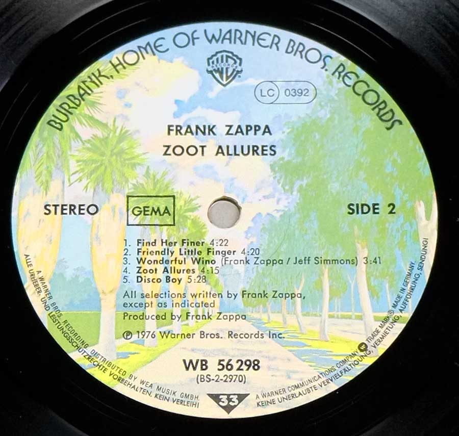 "Zoot Allures" Record Label Details: Warner Bros WB 56 298 ? 1976 Warner Bris Sound Copyright