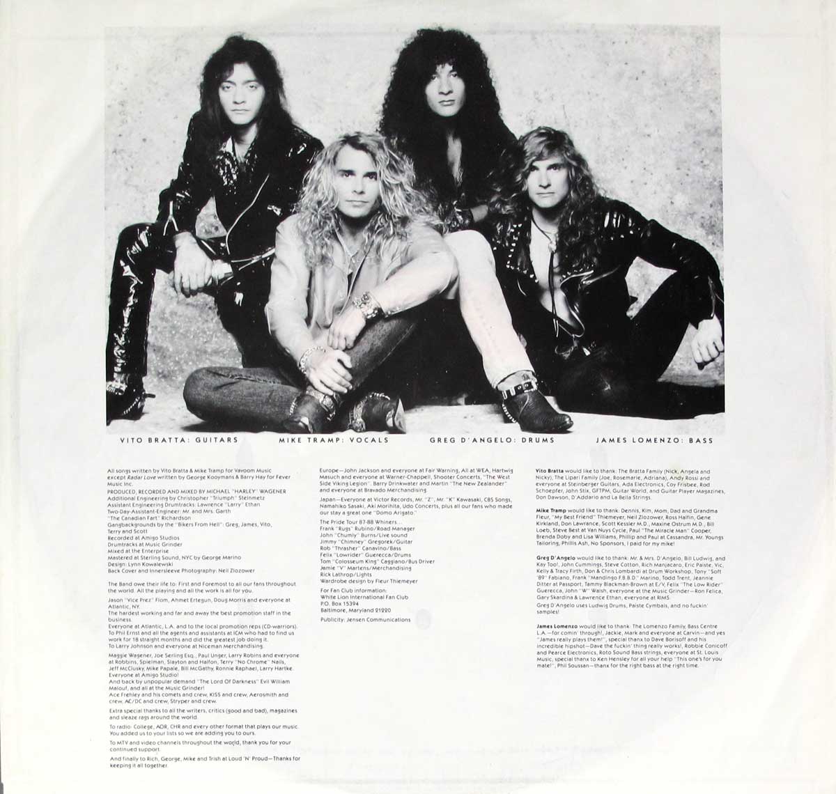 The custom inner sleeve of White Lion’s “Big Game” album features a black-and-white group photo of the band members. The image portrays a casual yet cohesive aesthetic, with all four members seated together, exuding a blend of confidence and camaraderie. From left to right, the members are Vito Bratta (guitar), Mike Tramp (vocals), Greg D’Angelo (drums), and James Lomenzo (bass). Each member’s unique style is evident, reflecting the hard rock fashion of the late 1980s, including leather jackets, denim, and bold hairstyles. Below the photo, detailed credits for the album’s production, acknowledgments, and other information are neatly organized, emphasizing the team’s effort behind the album’s creation. |
