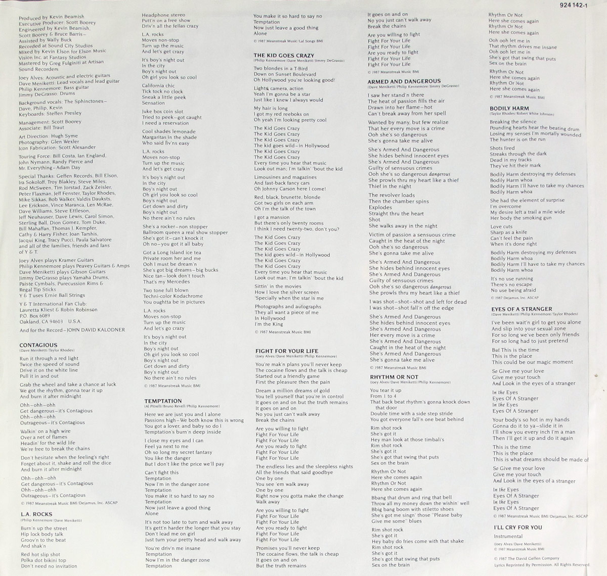 Song titles including Contagious, L.A. Rocks, Temptation, and Fight for Your Life are highlighted at the start of each section, followed by complete lyrical passages. The right-hand columns carry tracks like Armed and Dangerous, Bodily Harm, and I'll Cry for You.
