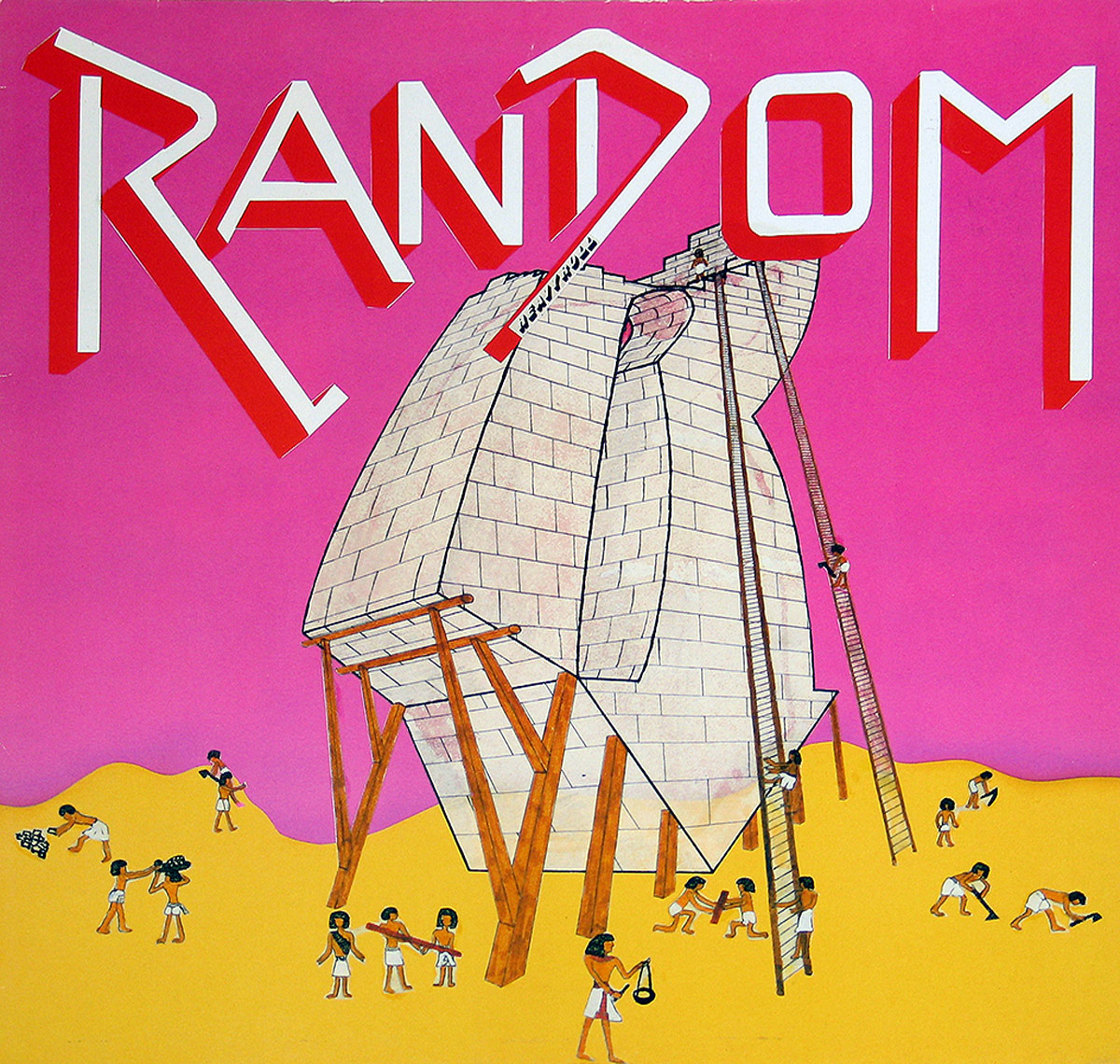The front cover of RANDOM – Randomised hits you like a neon sucker punch: an unapologetically bright pink sky blazing over a cartoon desert. The band logo — huge, angular, and slashed with red-and-white metal bravado — stretches across the top with the confidence of a band that knew subtlety was for other people. Underneath, the artwork plunges into a surreal construction scene where a stone monument rises awkwardly on timber scaffolds, frozen in a moment of chaotic creation.