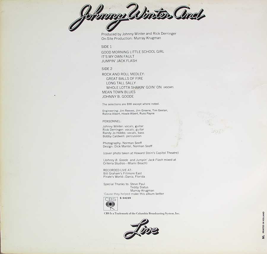 Album Production Information: The album: "JOHNNY WINTER AND - Live Gatefold" was produced by: Johnny Winter, Rick DerringerSound/Recording Engineer(s): Jim Reeves, Jim Greene, Tim Geelan, Ronnie Albert, Howie Albert, Russ Payne This album was recorded at: Bill Graham's Fillmore East, Pirate's World - Dania Florida Album cover design: Dick Mantel, Norman Seef Album cover photography: Norman Seeff |