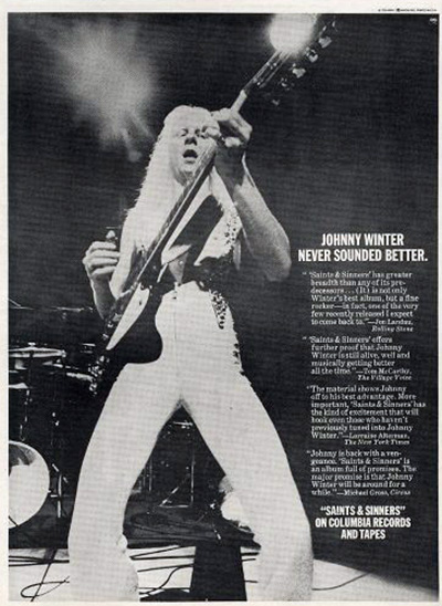 Johnny Winter "Saints & Sinners" (CBS-U.S. Import £2.45) A superior package and presentation to "Still Alive and Well", this is the closest Winter has come to delivering the perfect vehicle—and vehicle is apt for a record that trucks like an Inter-City express.