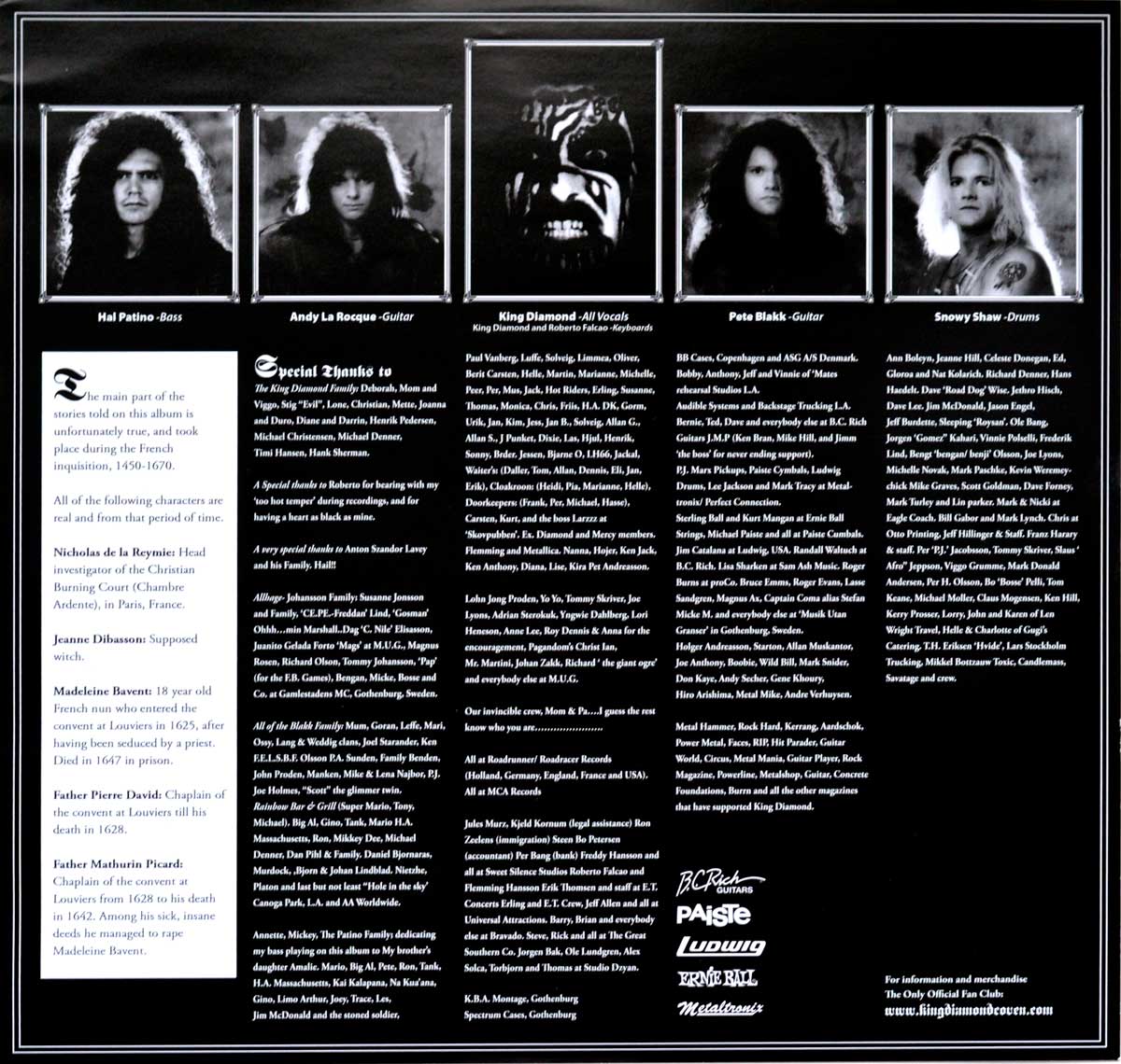 The left and central sections are densely packed with lyrical content, recounting the album’s dark, historical themes of the French Inquisition, persecution, and supernatural horror. The storytelling nature of King Diamond's music is evident, with detailed verses vividly painting eerie and unsettling imagery.