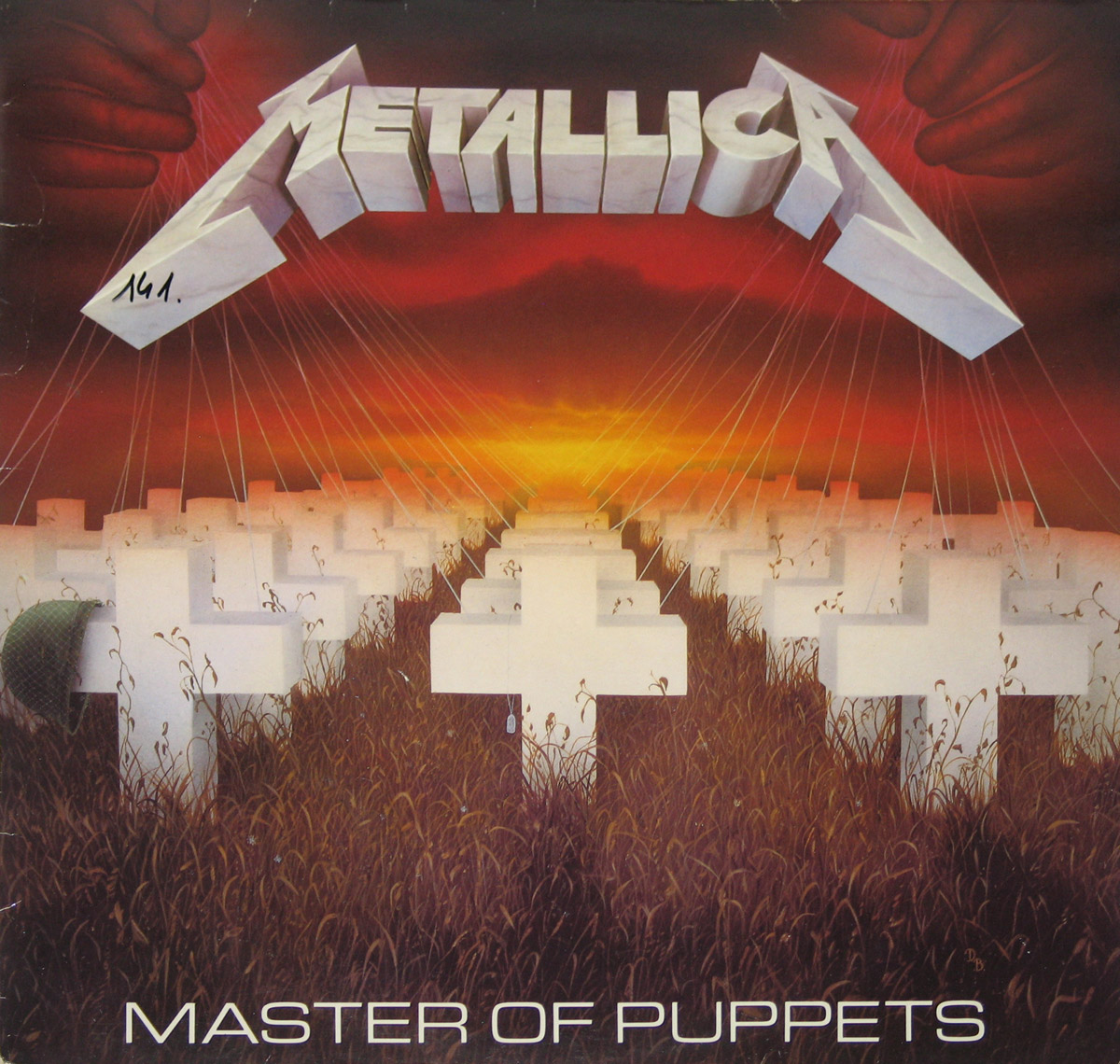 The album cover of Metallica's 'Master of Puppets' presents a haunting and symbolic landscape. A seemingly endless field of white crosses, resembling military grave markers, rises from the ground, their bases entwined with overgrown, dry grass. The perspective leads toward a fiery sunset in the background, with the sky painted in ominous hues of red, orange, and deep purple. The setting sun casts long shadows across the graves, emphasizing the solemn yet surreal atmosphere.