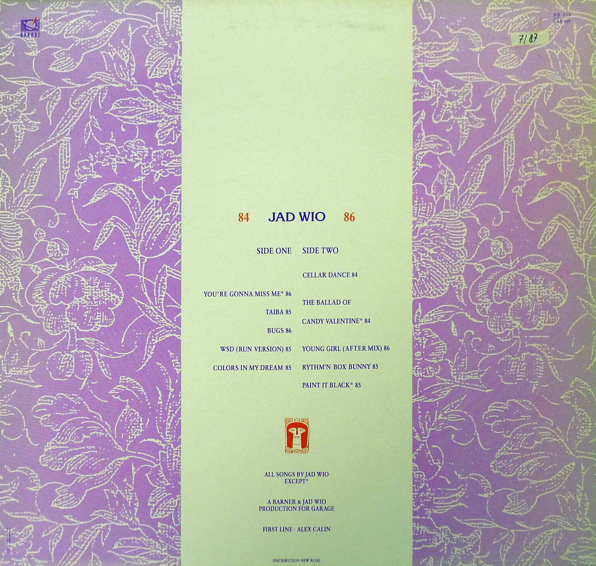 Below the tracklist is a small red Garage Records logo. Production credit is given to Barner & JAD WIO. At the very bottom, “DISTRIBUTION NEW ROSE” is printed, referring to the label’s distributor. The album sleeve’s structure and typography evoke a DIY underground vibe, perfectly aligning with the band’s theatrical New Wave identity.