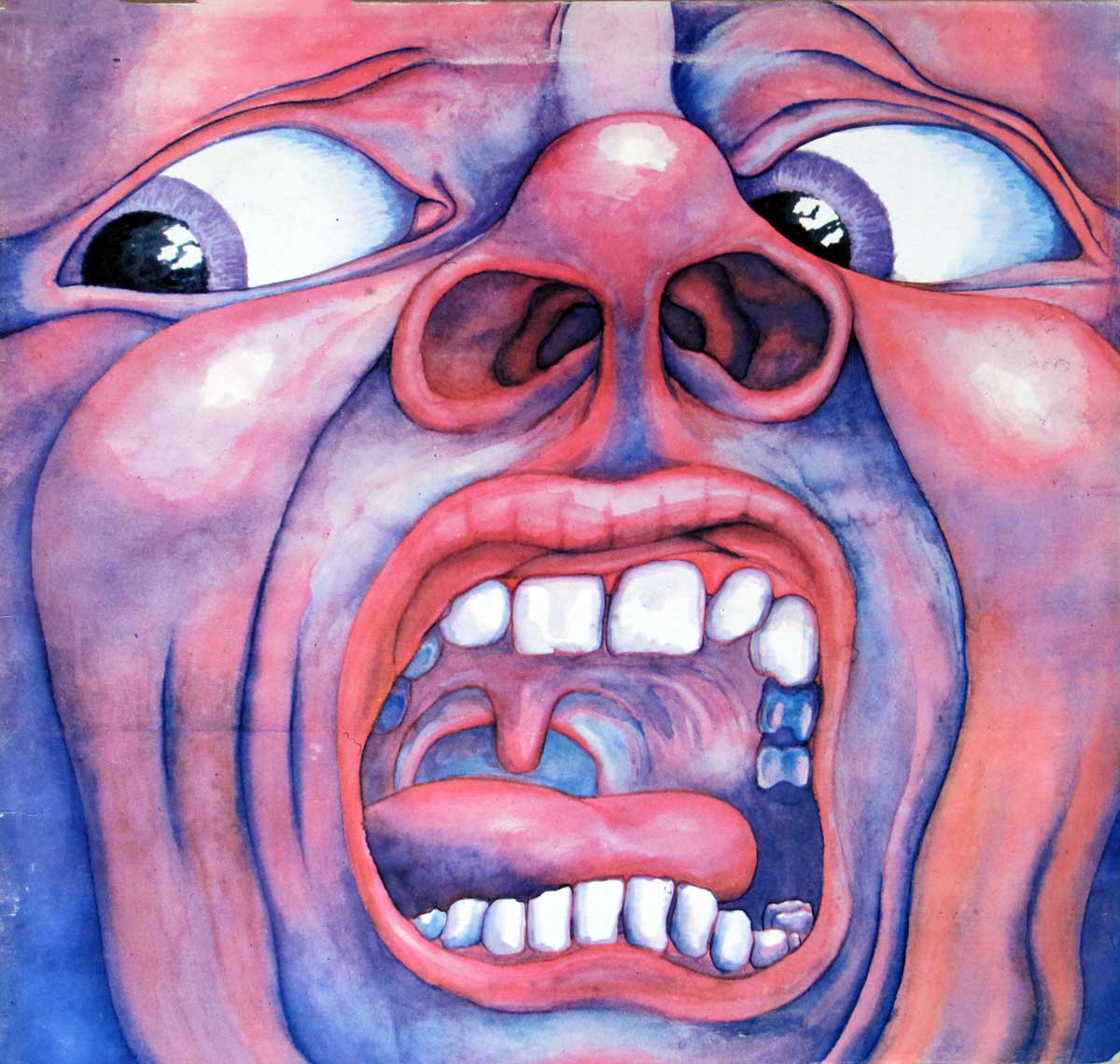 The front cover of “In the Court of the Crimson King” is a close-up painting of a screaming face rendered in vibrant shades of pink, purple, and blue. The expression is one of raw panic and anguish — the mouth stretched wide open in a distorted cry, showing teeth, tongue, and the inner throat in near-anatomical detail. The nostrils flare, the eyes bulge with veins visible beneath translucent lids, and the skin tones blend from warm reds to cool lavenders, creating a surreal sense of tension and depth.