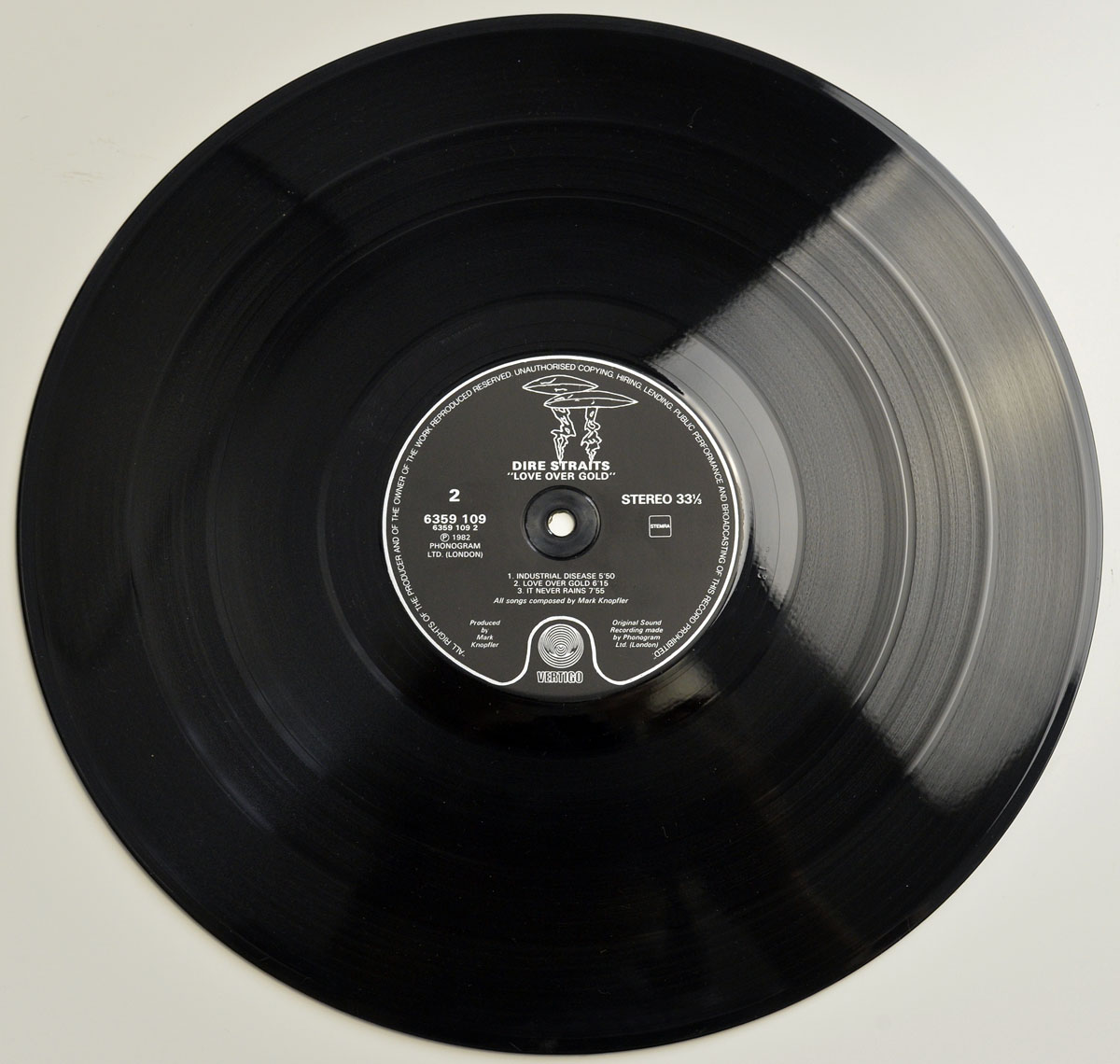 This is the Dutch Edition of Dire Straits 4th full-length album "Love Over Gold". This Dutch release has black record label with Vertigo "mushrooms" logo and with white lettering. Other release may have an orange label with black lettering.