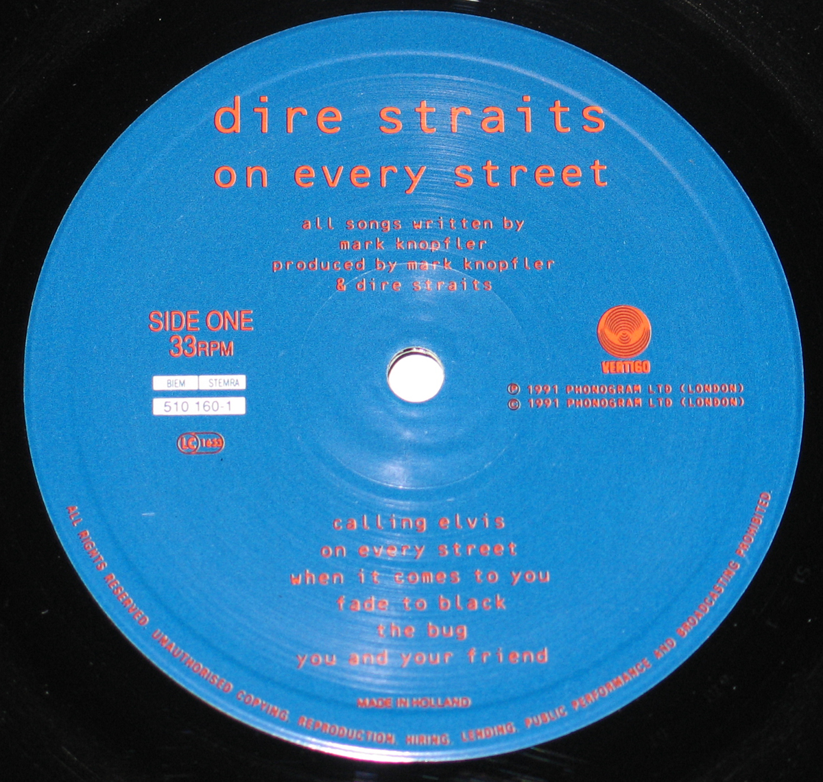 This close-up shows the Side One label of Dire Straits’ “On Every Street” 12" vinyl LP, released in 1991 on Vertigo Records. The label is printed in a distinctive blue tone with red-orange typography — a visual pairing that gives it both clarity and character. The band’s name and album title appear prominently at the top in lowercase, maintaining the minimalist aesthetic consistent with the album’s sleeve design.