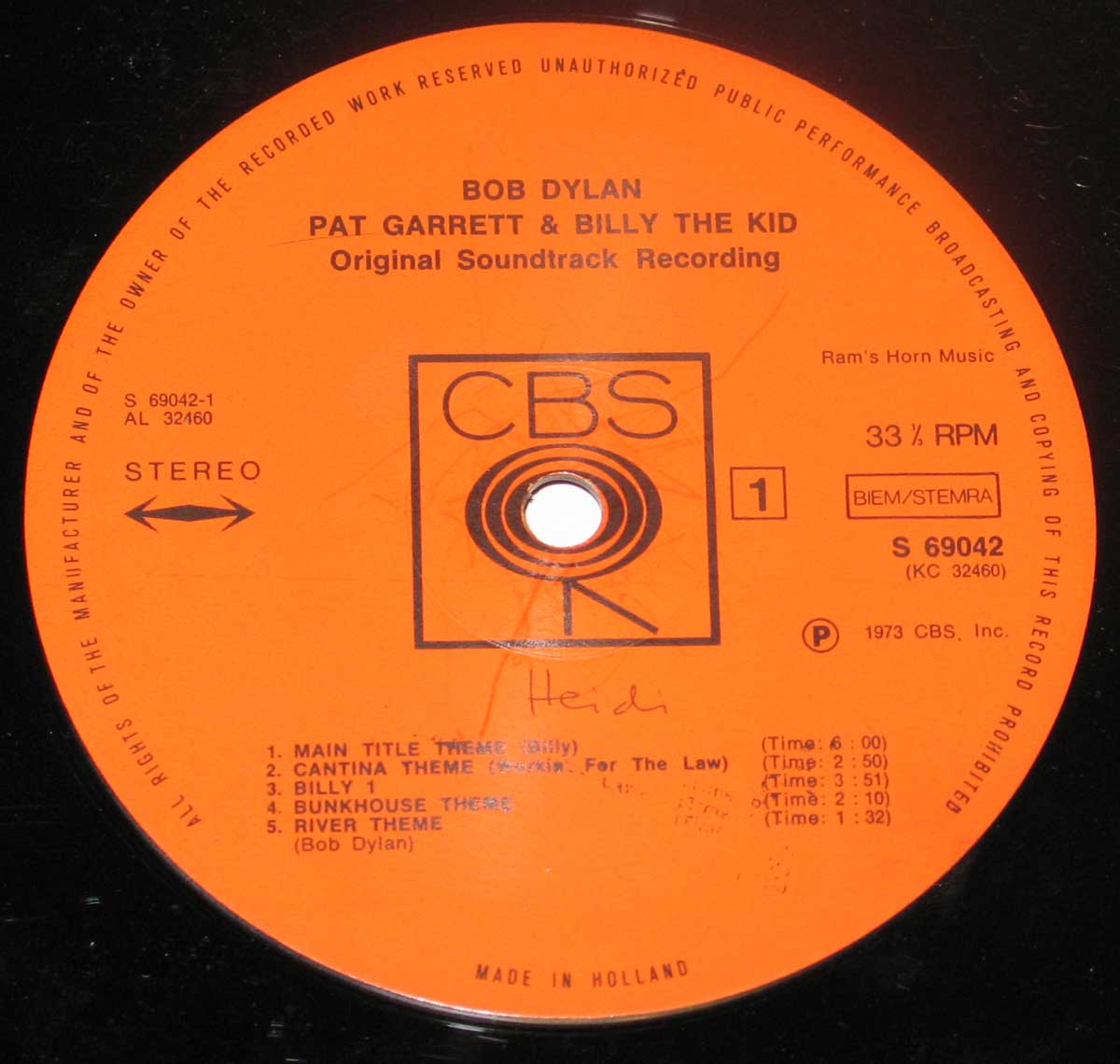 Close-Up Photo of the CBS ( with the walking eye ) Record Label of BOB DYLAN Pat Garrett & Billy The Kid