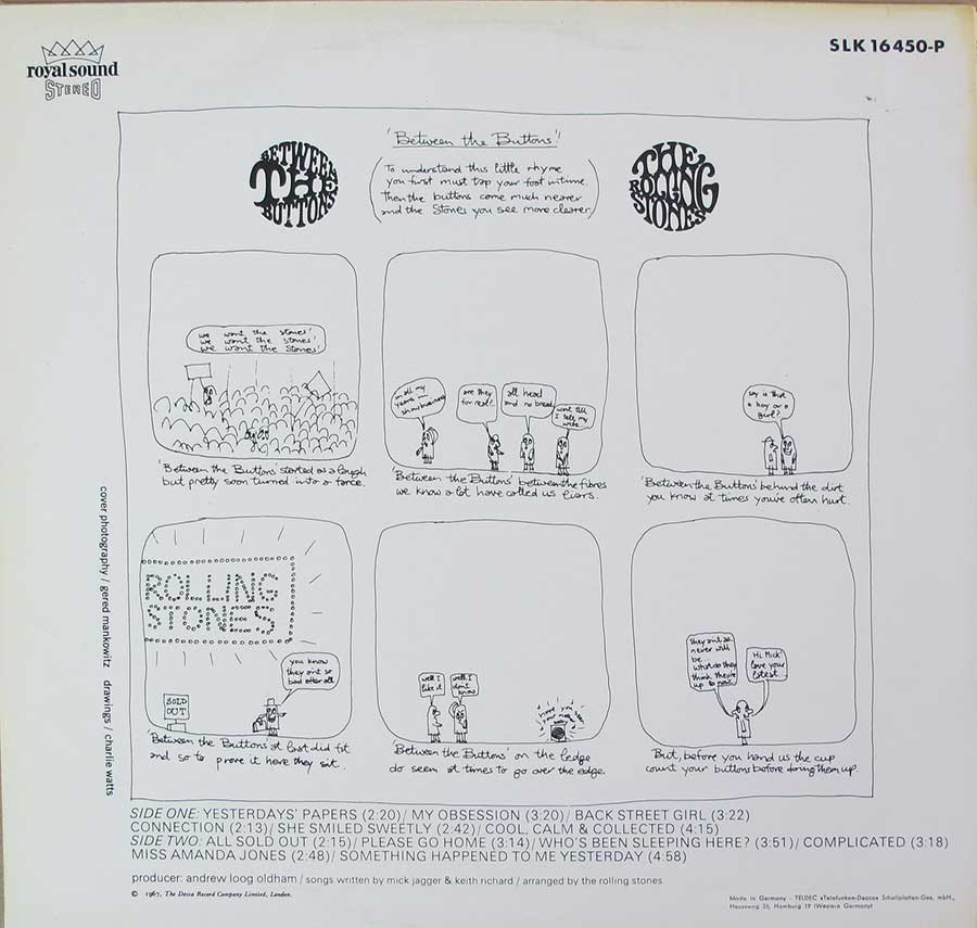Album Production Information: The album: "ROLLING STONES - Between Buttons" was produced by: Andrew Loog Oldham Album cover drawing: Charlie Watts Album cover photography: Gered Mankowitz |