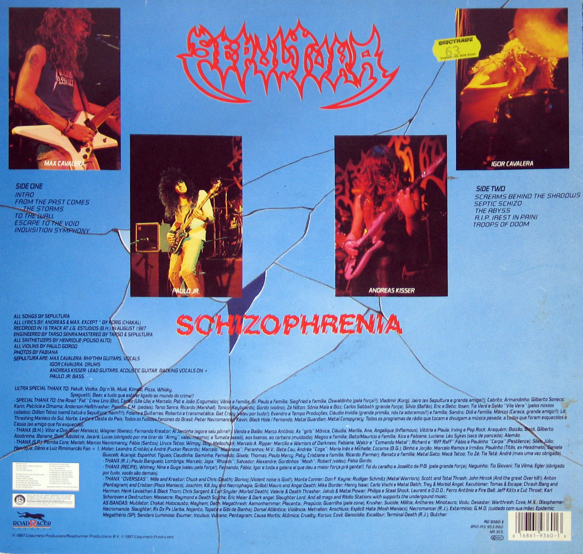 Album Production Information: The album: "Schizophrenia" was produced by: Cogumelo Productions Recorded at J.G EStudios (B.H), August 1987 Sound/recording engineer Tarso Senra, Sepultura Photography Fabiana |