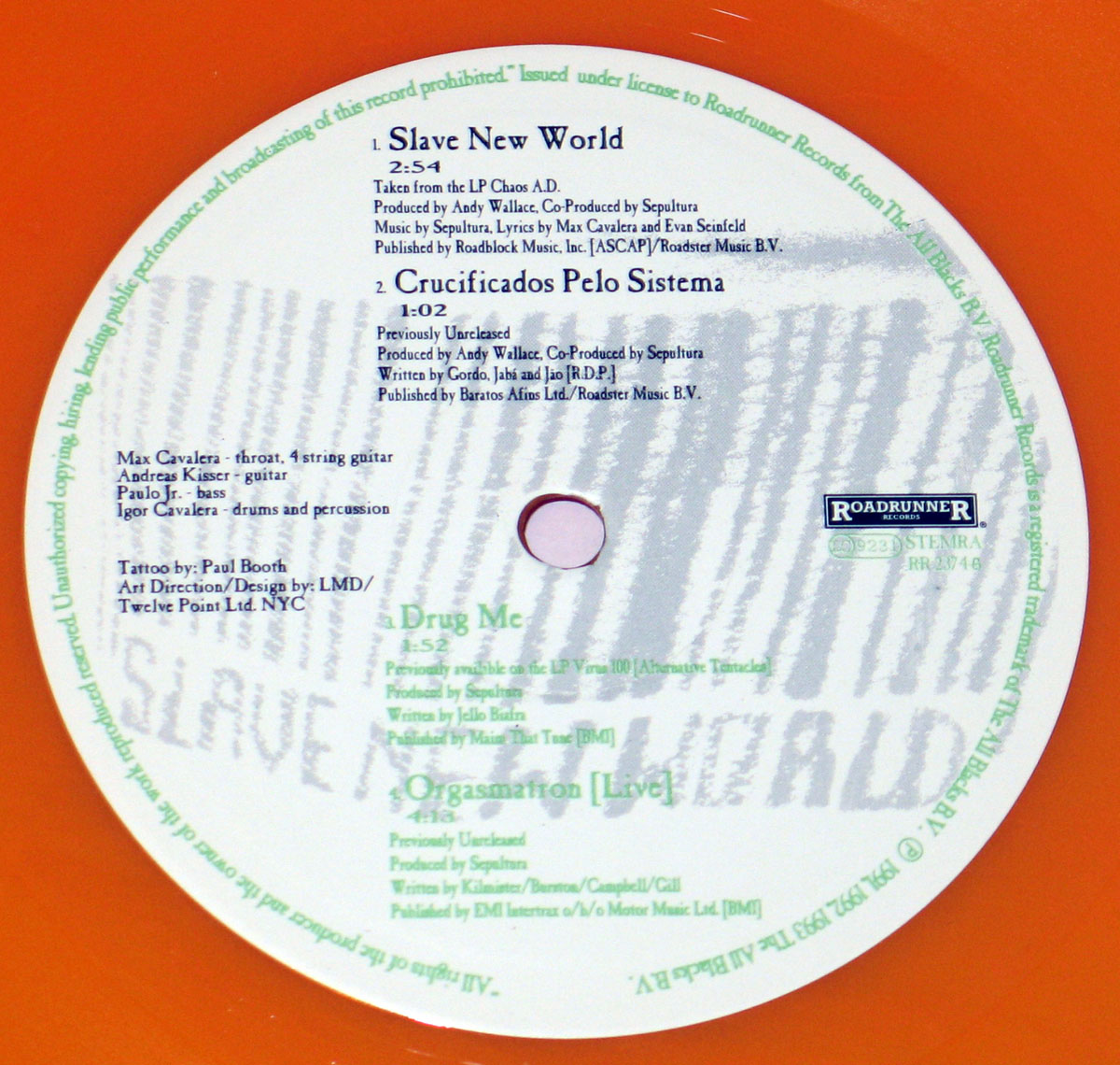 Collector's info: This Extended Play record "Slave New World" by Sepultura, this band covers three songs from others- Orange Colored Vinyl , Tattoo by Paul Booth |