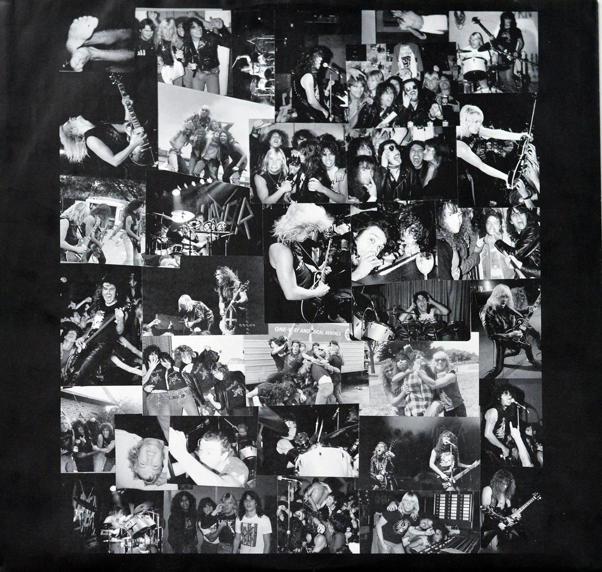 This black-and-white collage forms the inner sleeve artwork of Slayer's Hell Awaits LP, capturing the raw energy and chaotic spirit of the band’s early career. Dozens of candid photographs are assembled in a rough grid, filling the frame with frenetic energy and unfiltered personality.
