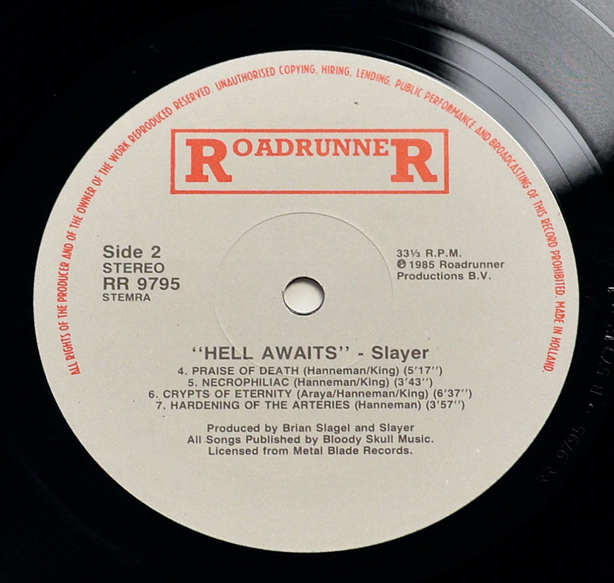 This image displays the Side 2 center label of Slayer’s 1985 thrash metal LP Hell Awaits, issued by Roadrunner Records under catalog number RR 9795. The label features a matte beige background with black and red print, consistent with Roadrunner’s 1980s vinyl aesthetic.